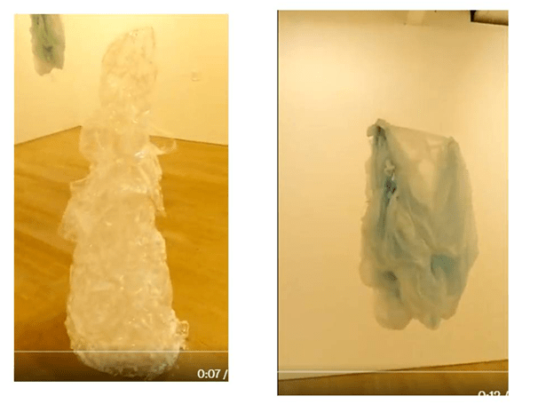 Even issues about how each of the sculpture stands or hangs or ‘flies’ depend on the movement of the viewer’s body and the relationships in space between them in relation to each other and that body. The body lends motion, resistance and attraction to the sculpture, helping to shape it as experience. And, of course perceptually there is much that is done by appearance and the relation of appearance to basic desires including appetite and its manipulation, which again, as in the Alice books, plays games with the apparent size of associated objects, as with the huge slab of what looks like a confectionery (a black forest gateaux perhaps) in one of the pictures (all taken from my own video record) above.