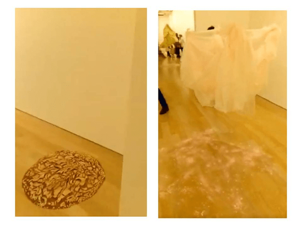 Sometimes the perceptual tricks are not only with objects where the relation of desire to the body is a wishful introjection or absorption (a ‘taking-in’) as in the confectionery illusions, so easily transformed into sexually appetitive structures, but are ALSO semi-excretory or post excretory. Thus it is with shapes that appear to retain the presence of objects from which they are the haptic and visible remnants. This may be a remnant of dirt but the employment of ochres and browns associate too with the excreted (and or vomited) that are sometimes patterned (accidentally or not – that is the game that is played). We will see this in the floor patterns which have a perceptual solidity and may indeed be in relief but not necessarily, as in the ornate brown pattern at a portal between rooms, discretely in a corner but inviting us not to tread in it. When these are patterned they are so by apparent relations of flow of some now dried liquid. We see that in the hanging work in the same room of some diaphanous fabric from which powder has dropped (randomly or not) on the floor below, creating another set of boundaries rising up around the hanging structure.
