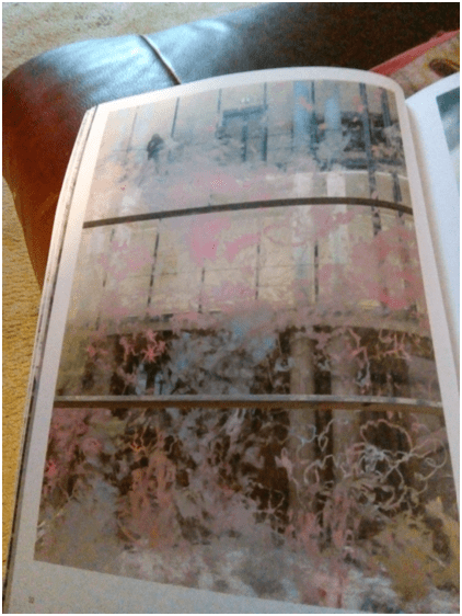 These are compelling when the marks (or emissions) are on transparent glass – as used very often in the Frankfurt exhibition which varied use of modernist pilasters and rectangular frame windows in a structure that rises. The windows are literally coated with materials that may be marks or projected sprays and which smear and ooze in order to obscure our vision of what lies behind the glass.