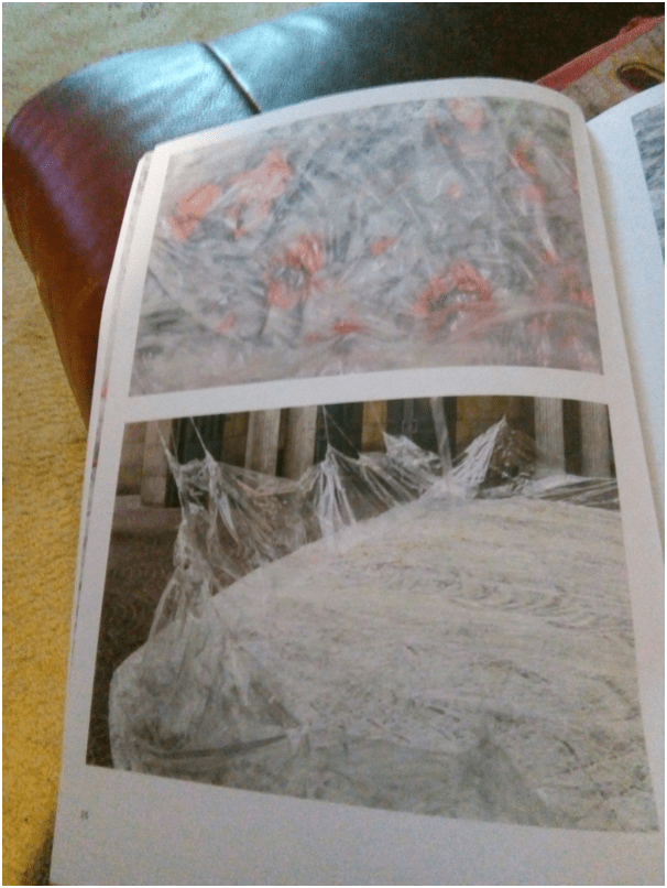 The Schirn work Conditions at Frankfurt the use of cellophane structures played with both the transparency and reflectivity of the substance, although mainly it is reflexion of light rather than image, of such large almost accidental structures as in these examples. This is even the more so where the colour patterns of the materials deposited on the cellophane are not just marks of varying colour, density and transparency but part objects themselves like shards of coloured transparent glass, associating with something that is harmful potentially. The examples cannot do it justice you need to see the wonderful book:Karla Black (ed. Katharina Dohm) Frankfurt, Schirn Kunsthalle Frankfurt, Verlag für modern Kunst.