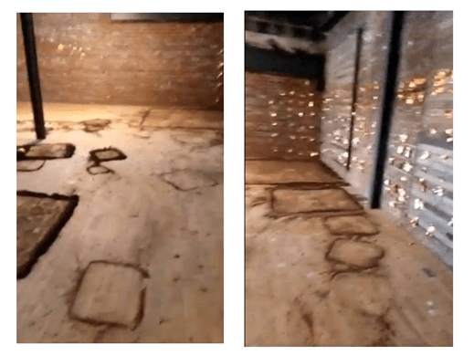 Certain feature of comparison jump out such as the slatted back board of the fruit vans that may have inspired the front wall screens we see in the artwork, but the main feature I notice is the omnipresence of stacked boxes being moved from the trucks to be stacked in the warehouse. The boxes not being uniform must have meant that stacking them challenged the ability of the handlers to find ways of stacking them that had no regular form or template, for it is the remnant of such stacked structures, at a time after the structures have been moved from the market warehouse, that might explain the traces of detritus the box like shapes on the market floor may have formed, as in the example below, where the detritus surrounding removed boxes may explain the difficult pattern of objects that are no longer present but exist only in the marks on the surface of the floor that their presence made.