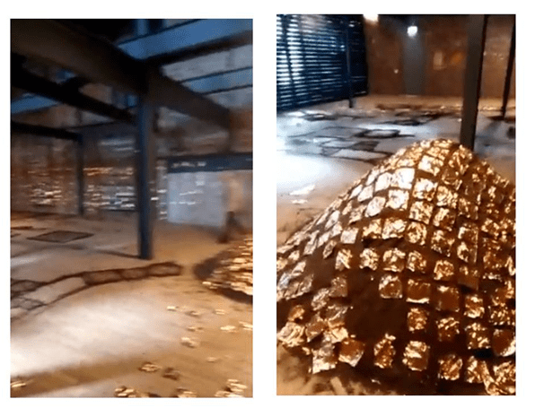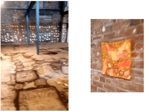 Are these the effects of art or accidental contingency in either space or time. We cannot tell but versions of such patterns, variegated by colour, and contrasting with the regularity of the wall’s brickwork, seem to betoken a more planned two-dimensional version of these floor surface structures as in the picture on the left above. And then there are the regular marks formed by gold leaf patterned on other brick walls, which also illustrate a dimension offered by stacked objects – height in this case, though their regularity and idealisation (perhaps the reason this detritus is gold and copper leaf rather than the ochre paint powder forming the floor patterns).