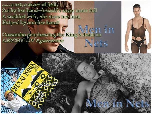 Nets are a snare to men whether as prostitutes in Ecclesiastes or faithless and revengeful wives and mothers (since after all Agamemnon did kill her daughter Iphigenia as a sacrifice to the gods) like Clytemnestra. And nets are an implement of manly use turned against them as if their very masculinity conspired against them. Of course my poor collage plays with this idea – from the use of nets as an implement in queer seduction, or wishful versions of that as in the early photograph from Vaughan and the pastiche of the man in ‘women’s’ (?) net stockings (such images are legion on the internet) I use therein. Of course nets can imply a tool of safety as well as destruction – an idea I also try to incorporate in my collage.