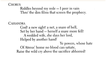 In Aeschylus’ Agamemnon those associations merge into a fantasy when the heroic anti-Trojan war leader’s murder by his wife, Clytemnestra, is foreseen by his Trojan slave-concubine Cassandra, in her divinely-inspired vision (of course treated as frenzied madness) in his bath with using spear and a hunting or fishing net (it is thought by some translators and commentators). Here’s the speech: