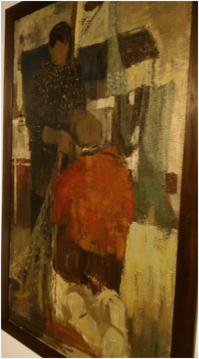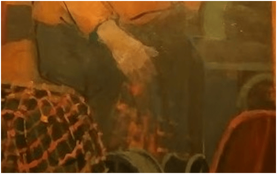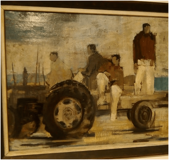 Salmon netting is a knowledge base of its own and we need at least a little knowledge (I have only what is at this link) to see why a painting with this title shows very little attempt to represent the nets used, although the distinctive orange can be detected in a paint mark to the left of the standing figure on the floor of the trailer to the tractor. The tractor is important since salmon netting is about setting nets in shallower seas and coastal areas rather than fully engaging with nets at sea. Hence the long waterproof boats of the men and the engagement of a tractor. What excites us visually in this painting is the coarse boundaries between figures that distinguishes them and their facelessness. What we see is flexed tension of a stand or the bend of a knee that feels to be about male bonding and diversions from it – in the isolated standing figure for instance. I certainly feel the texture of their closeness in part because the painting is obsessed by textures – particularly of the white clothing work by the netters, and the give-away huge hand of the standing figure which seems to communicate the fact that it is touching the cloth on which it rests. The man feels himself at his own boundaries. The central seated figures seem to lose boundaries between each other altogether.
