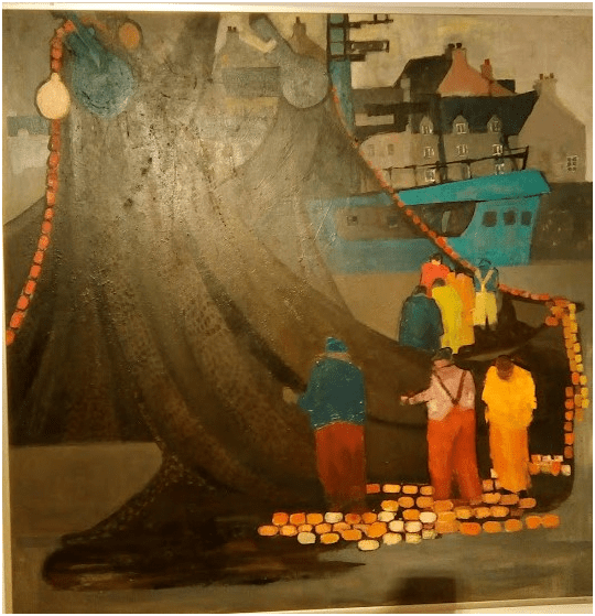 In Iasgar Mor blocks of colour with too little sense of boundary from each other seem to engulf the sitter, an effect we also see in Balaich an Iasgaich, a painting of 1974.[4] In the former oranges constitute the space in which the man sits as well as his clothes and bare skin, whilst to his rear is a realistic harbour scene predicting the future use of the fishing net at sea. Our attention is drawn in this painting, as in many others of Smith’s, to the entanglement of the man’s hands in his own nets, such that it too, coloured in a similar orange seems to be pulling the seaman down into it. The classic example of this is that wonderful group of men, in which their emotional isolation from each other that is also, of course, concentration on task, is connected together by work on nets for a variety of uses and snares.