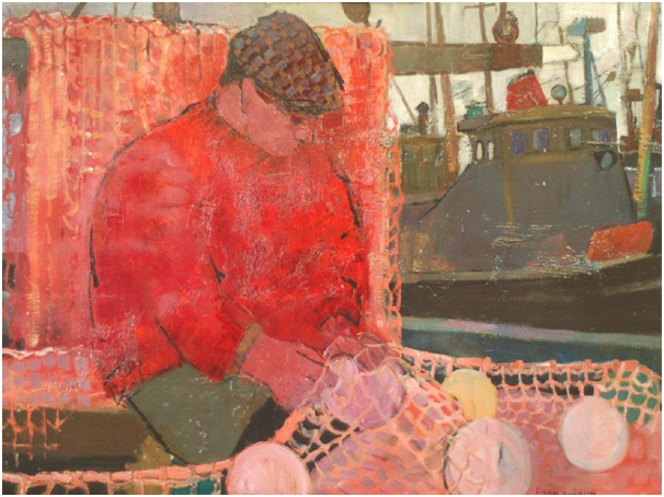 If limp and non-purposive masculinity in relation to men involved with nets is sought, my favourite would be the oil on panel painting named Stornaway (rather unhelpfully for identification purposes)