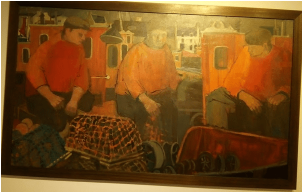 I can, of course, only state my view, however it might appear I am doing so, tentatively. When I look and respond to Smith’s paintings it is often to the feel (not necessarily either simply a sensual or haptic sense of touch nor abstractly emotional but both in interaction) about male groupings that feels like a kind of complex bonding that can’t be stated simply or normatively and is therefore queered. Of course I don’t mean by this that they are sexualised groupings, which they are, say, in Keith Vaughan’s various Assembly paintings, but rather that they excite us as bodies (meaning groups of men as well as individual bodies)that evoke embodied reactions not comfortable to some and certainly apparently intrusive. There are pictures of men with naked torsos at work that could be said to evoke a kind of homo-sensuality (rather than homosexuality) like the unnamed drawing of men at work digging peat in summer, but I found only this and my response may indeed be eccentric.[5] A better test case of what I mean is the well-known and beautiful painting, from the 1970s known as Salmon Netsmen (below).