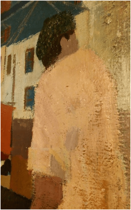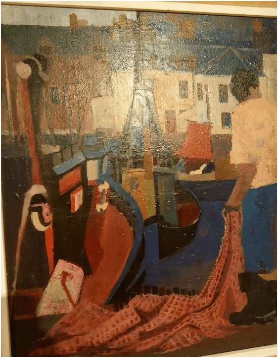The effect of a near random grid of blocks of otherwise patterned colour below the feet of the group at the front may represent something ‘real’ in the scene but it is not clear what that object or objects might be. The patterned blocks also, perhaps because of that breakdown in their representational purpose, draws our attention to the flat surface of the painting itself divided between different sectors by vertical, horizontal and transverse lines. Sometimes they reduce the figures to similar patterns of colour patches (such as the largely internally unvariegated patches of yellow, red and blue that constitute the men’s clothing), which also reflect upon each other. This use of patches of colour makes for the effect of an abstract shaping of the surface of the painting that is at odds with other elements that demand both a depth perspective and a vanishing point associated with perspective in ‘realist’ or representational landscape painting. If the background of the town of Stornaway is realistic, then as we move away from it there is much more sense of spatial distribution based on relationships of patterns of colour brought to a viewer’s attention. In more than one way the ‘big net’ contains these men – by its linear boundaries and by depths and distances of perspective it is also used to portray, making of these male groupings something quite separated from the realistically captured quiet town beyond the harbour, that operates more like fantasy.