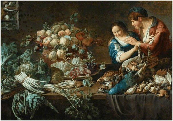 The gallery information reads the sexual morality implicit in the picture. Ominously this says, blaming the victim of rape for any potential rape in doing so unfortunately, that the female in the painting is allowing the male to go too far in his attentions, although it is not immediately clear that this is the case since she is pushing the man’s intrusive hand away from her breast. Moreover the woman is painted in a position of retreat signified by her lower lateral position and depth in the perspective of the painting as being visually dominated by the man here. However, the commentary is helpful in pointing out that the depiction of dead birds under the intrusive act is significant, since ‘vogel’ (the Dutch for bird) pairs with term ‘voegelen’ which in slang Dutch of the time is associated with sexual activity. The point to the caged monkey at the viewer’s left and the possibility that that meaning is involved in the visible decay of the fruits on display, since, I suppose: ‘You will know them by their fruits. Do men gather grapes from thornbushes or figs from thistles?’[1]
