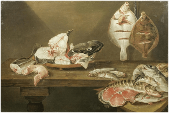 We need to take these lesions into the next display area, a passageway showing domestic stilleven art. I was not aware before this exhibition that such art had sub-genres, of which paintings of dead fish were one and those of breakfast goods, known as ontbijites, another but I do now.