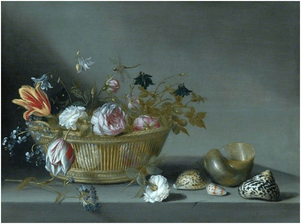 Further information picks out the significance of tulips in the painting, since these were a Turkish import to the Flemish coast only in the sixteenth century. Moreover the varied seashells here necessarily tell the story of many cultures and places of travel and economic exploitation being imports that only the scope of the Dutch East India Company could satisfy. This then is an art of excess wealth. If the moral occasion of the scene is less than previously then this is because the owners of such art could afford not to be reminded that their wealth had a cost, often to other exploited peoples than themselves.