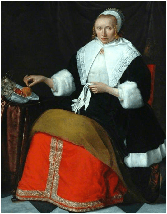 A lot of the art of the painting is merely reproducing the fine art of the clothing here with sumptuous reds and gold framing placed together with a sumptuously rich fruit bowl, containing grapes Zeuxis himself might have painted, and thus representing the finesse of fine art. The lay is clothed with gold and is bejewelled by rings, earrings and cuff decorations featuring both gold and pearls. If the latter might enhance the morality of this rich lady, her scarlet under-dress does not; although it is difficult to suggest that the painter is referring to the Scarlet Lady here (I am sure he is not). But black and white contrasts never stand alone and this lady needs to display more than her moral rigour, she needs to show that she is both wealthy and powerful. If fine white lace is only costly in the lives of female workers, her ermine has cost animals their lives.