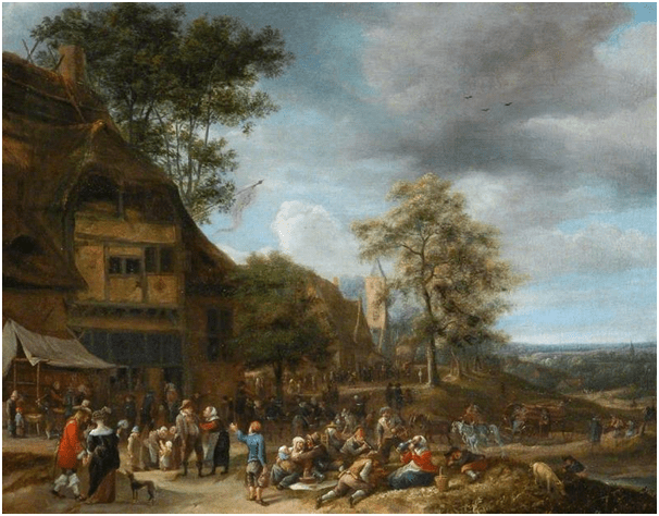 This is a tremendously powerful painting but riddled, in my view as its Bosch influences are not, with class prejudice specific to the rich nation that was the seventeenth century Dutch Republic. Of course the villagers are merely eating, drinking and smoking but these commodities are themselves not only morally of concern in excess but also coarsening. The ‘lovemaking’ of the peasant villagers is clearly meant to be contrasted with the genteel manner of the bourgeois courting couple who observe this scene for us and give it contrasts that are behavioural but also ethical. The dominance of this huge inn is deliberately contrasted with distant steeples of the Dutch church. There is contrast then of the messages of peasant merrymaking and a religion validated by a Protestant State. It is not for nothing that there is a chain of being across the bottom of the picture’s surface frame from well-clothed bourgeois to boozy coarse villagers and ending with a pig on the viewer’s right.