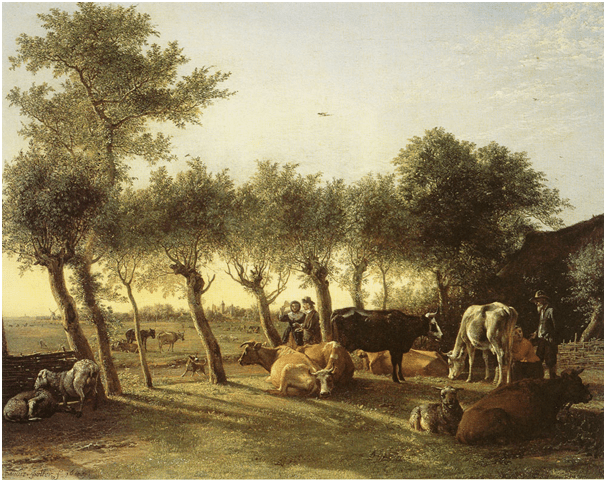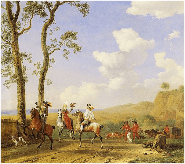 Of course Steen is a social satirist and the take of someone less threatened by class difference is clear if we contrast in this room (see both below) Paulus Potter’s (1625-1654) paintings The Hunting Party and A Farm Near the Hague. Both revel in idyllic rustic landscapes although the former emphasises the ownership and control of natural life by aristocratic life whilst the latter merges the peasants into the lull of an evening pastoral. In both cases and in the contrast, all is harmony – it is I’d say obviously ideologically so and the peasant picture in particular forms a wonderful contrast with Millet and, more so, Van Gogh on this subject where poverty and danger predominate.