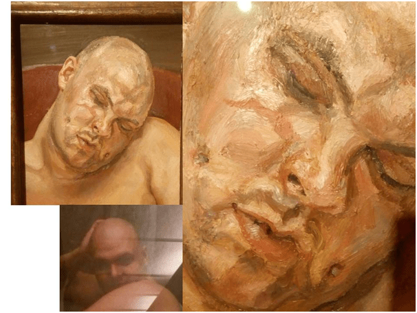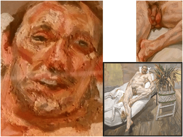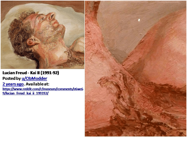 The photograph of the impasto effect is my own. It shows the simplicity of the marks which reproduce the effect of layers of hair, skin and fat that make up middle-aged male skin and it is felt in the heaviness of the brush-strokes and dabs of paint. For a clearer example look at how Freud constructs his own penis in Painter Working, Reflection (1993) – use the link to see a copy of that painting.