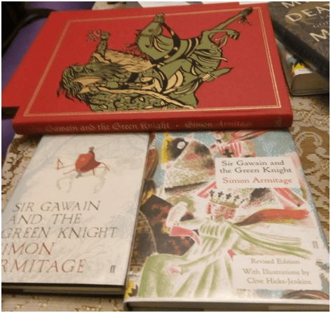 Even as I remember teaching this text, in those days where queer theory was new territory to me as a teacher, I remember learners in this class, including Catherine’s bright husband (then a very young single man), picking up the ‘queer’ way in which the exchange of kisses in Hautdesert, Bertilak’s castle, between the patriarchal lord Bertilak (played by Joel Edgerton in the film) and Gawain is a contract that might, had the lady succeeded in sexually seducing Gawain as instructed, would have meant Gawain offering very embodied sexual love to Bertilak at this point rather than just a kiss. It’s a queer focus in this old poem that is presented very visibly in the film and even in the illustrations of the text as illustrated in some very beautiful editions of the Armitage translation in my collection of Armitage ‘firsts’.