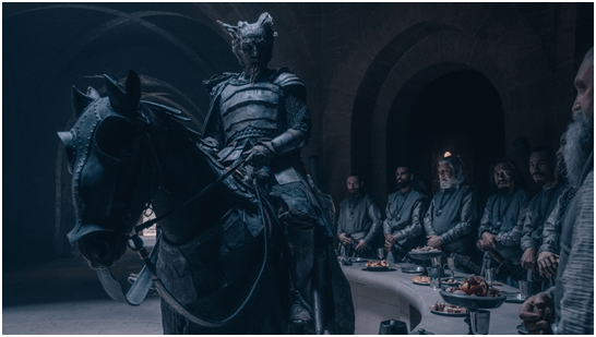 When the Green Knight enters the film he is not only green but oozes green into everything around him: mise en scene and characters. Look for instance at this still:
