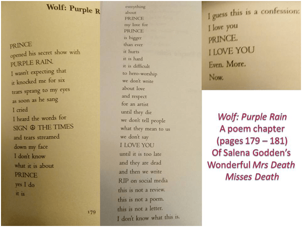 How unlike performance, as it might once have been and herein lies the reason for the attitude to past heroes of performance art, which Wolf predicted in the preface, especially to Prince, and especially in that beautiful poem that is also a chapter (how I want to hear Godden perform it): ‘Wolf: Purple Rain’ (pp. 179 – 181).