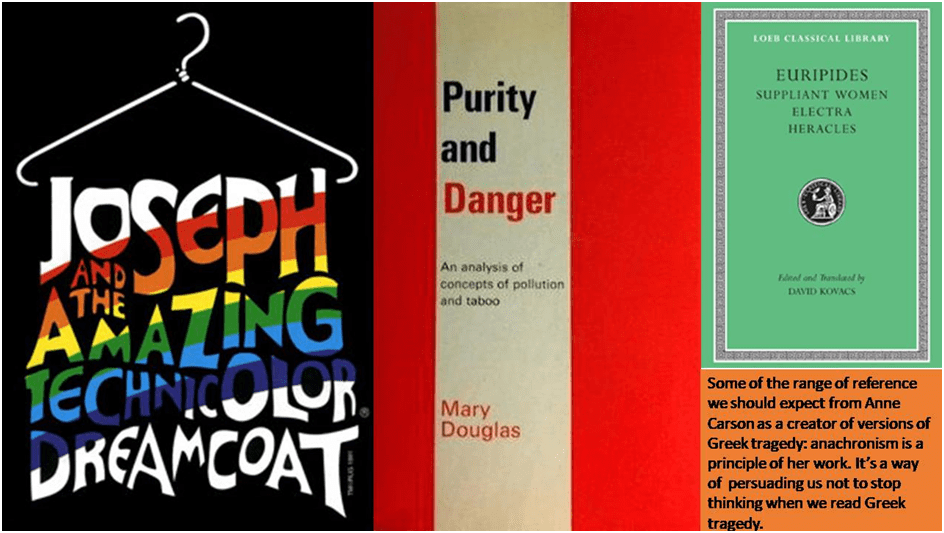 We can finish then with best sentence in Emma Heath’s review to which I have already referred: ‘In one beautifully bound book, she has stitched together the Anne Carson starter pack in Euripidean gift wrapping’. We need perhaps to have Heath’s knowledge of Euripides to understand this but this a good summary of that knowledge, one with which I fully agree (from my admittedly more junior acquaintance with the texts):
