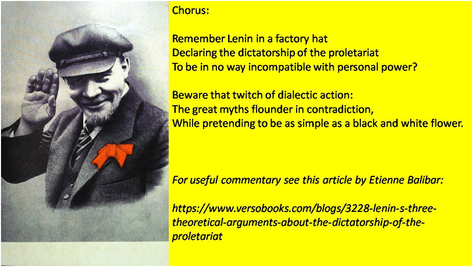 These are the very least of the anachronisms of reference in this play, for H of H is all heroes and all the circumstances which birth the contradictions of their action, whilst understanding themselves or being understood as heroes attempting to, in some way, ‘cleanse’ a dirty world. Most important in this list we’ll eventually find Geryon, the hero of Carson’s early versions of Stesichorus’ classical verse narrative in her early books Red: An Autobiography and Red Doc>. However, the most notable hero from the offset is Lenin, hero of the Russian Revolution and a man as compact of contradictory myths as Heracles. On the Chorus’ first entry in H of H they sing a song about precisely that: