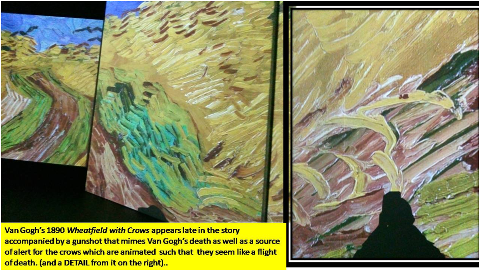 I think the motion of the visitor’s body and its sense receptors ate also important to the experience but one feature of the display is that the quality of resolution of the images shows the volumes of applied paint and thus allows us access to the sense of how brushstrokes were manually applied – an important feature in my Van Gogh. The collage below shows how a painting is distributed across the screens, and therefore spaces at different depths and a detail from the same reproduction, which I think shows the way in which the density of brush strokes can be seen, and, I would say, the feel of Van Gogh’s ‘hand’ at work and in motion.