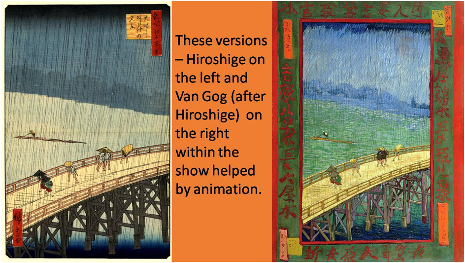 One feature that again Justin emphasised to me is the nature of Van Gogh’s japonisme, since he has a great and beautiful appreciation of Hiroshige. Indeed his love of the flatter surfaces of these nineteenth-century Japanese masters he contrasted with what seemed the’ gloop’ (a good word I think) of Van Gogh’s impasto effects. Yet the display actually contrasted the most famous (perhaps) of Hiroshige’s works, ‘Rain Over Bridge: Views of Edo’ with Van Gogh’s own version of it, which the display highlighted certain key features silently by animating the slanting fall of the rain in each case.