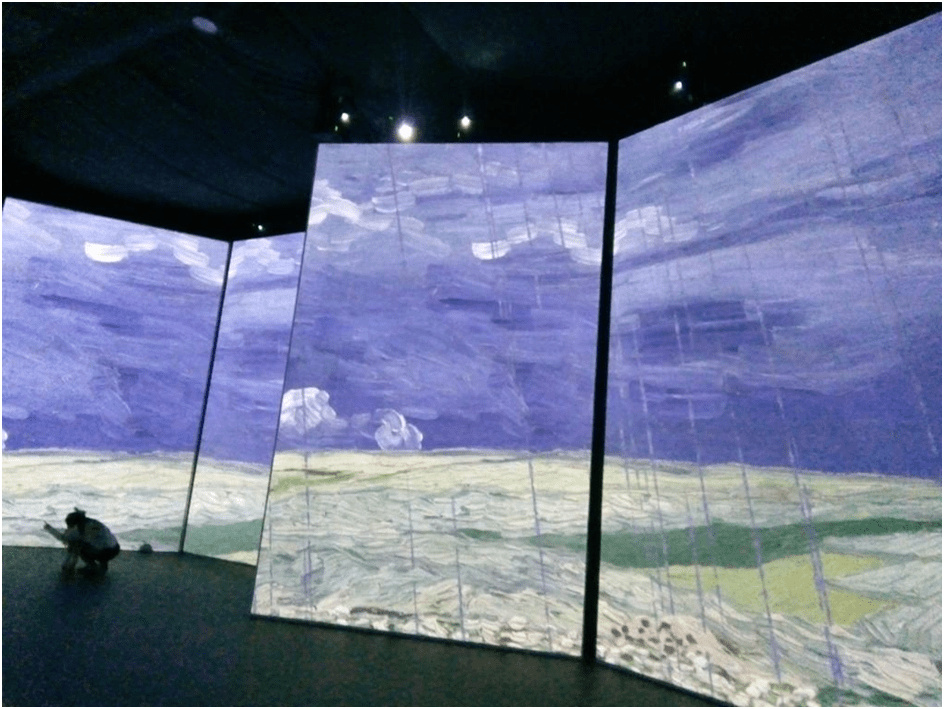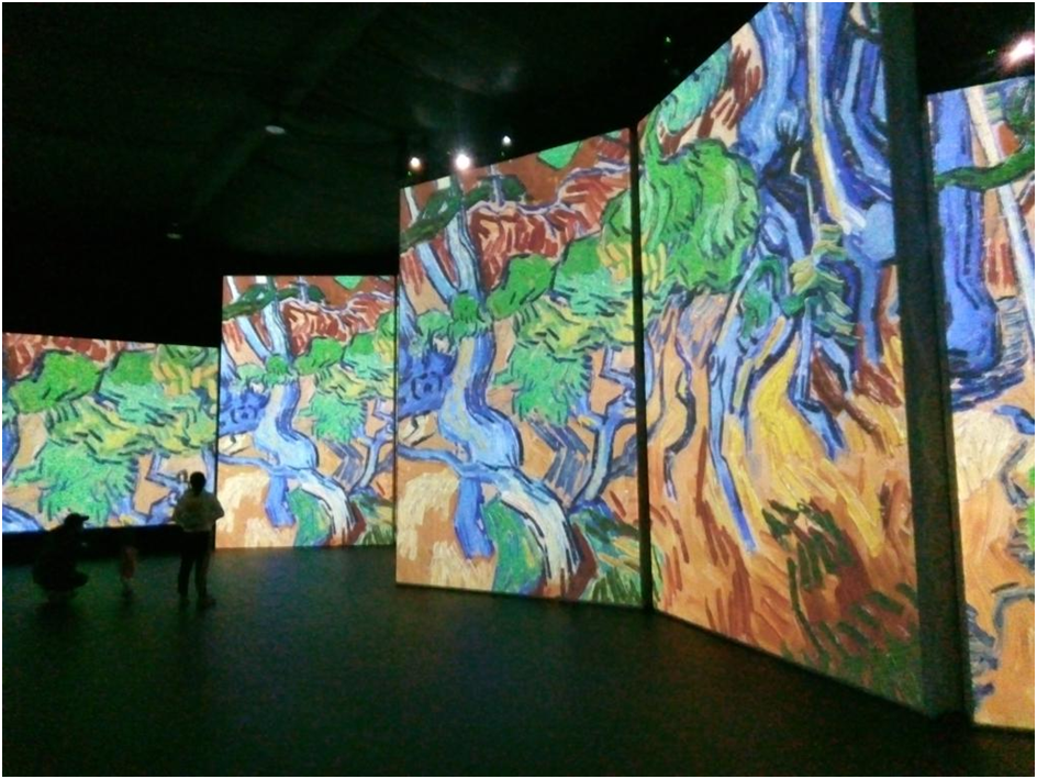 SENSORY4TM is a system in the sense that it brings together a number of technologies for the projection of material to a range of senses. Calling itself unique is really a recognition that no combination of projection technologies cannot but be unique, defined by their purpose. In the Grande Exhibition system sound projectors create a sound that surrounds the rooms inhabitants – an effect in cinemas called surround sound since it seem ubiquitous and immersive. The sound is of well collated classical music pieces, often from Van Gogh’s own time.[5] Likewise using a large number of high definition projectors and ‘multichannel motion graphics’ means that high resolution images can be varied across screens at different depths and with varying perspectival overlap as visitors move around or be versions of the same image be projected as a total surrounding visual medium, that is sometimes static and sometimes capable of adding elements of motion across the static image – such as the image of the steam train that takes Van Gogh from Paris to Arles.