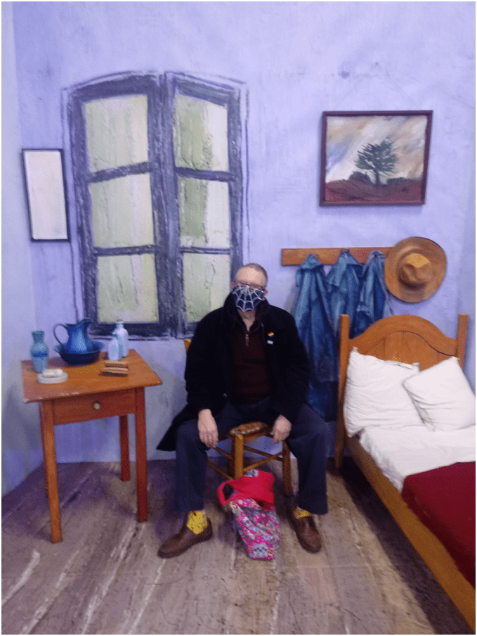 We stay in one room to see these wonders. Other effects look somewhat cheaper, such as Van Gogh’s bedroom in which I sit below – photo by Justin Curley. Although it was interesting to sit within the recreation of the perspective effects – the foreshortening of the bed.