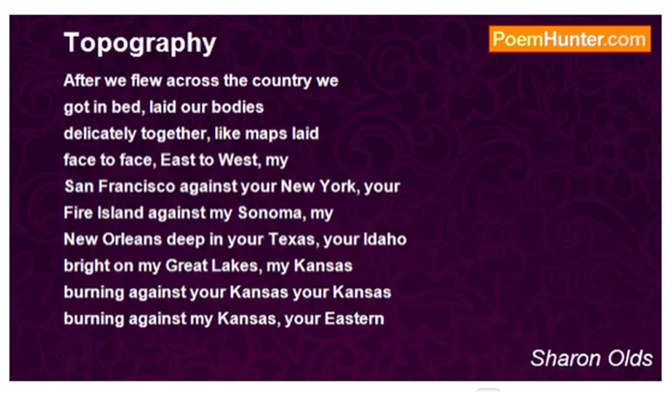 This is a poetry of the body as place for we move from encounters with the body either naked or behind clothing barrier (‘a parting of the legs … my body laid down … opened zip’) to be offered places receptive of the poet’s kiss (those indefinite topoi ‘here’ and ‘there’ seeming to be body places in the earlier context to literal physical places in which a kiss might be given just as the names of men that follow can be the names of streets flowing onto Oxford Road or men.