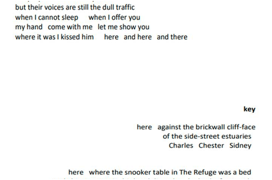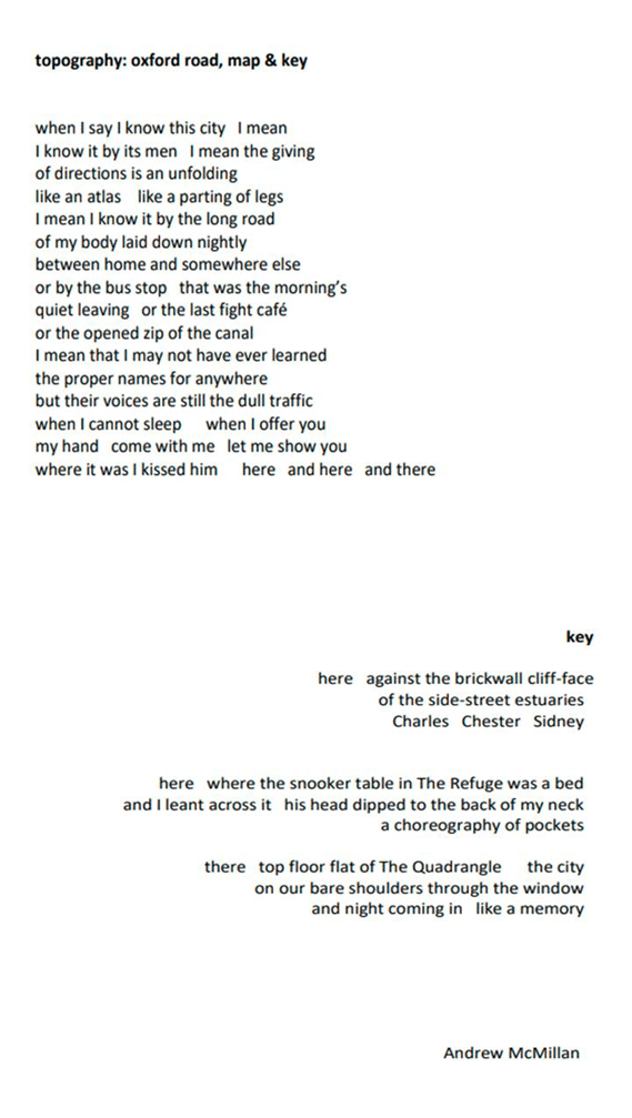 For we learn to name places through absorbing ‘proper names’ given to them before our supervention, and to rename them through their function to us – as a ground for cruising for casual sex with men by men – is to change their being and to demand a new ‘key’ to those meanings and the names we give them. This is an act poetry has always claimed as its own territory – the issues of the body, queer male desire and masculinity only more recently. Oxford Road Corridor becomes a kind of backbone and a river, with ‘estuaries’ at the mouth of its confluence with other streets, whose names are those of men with whom we may have shared sex: Charles Chester Sidney.