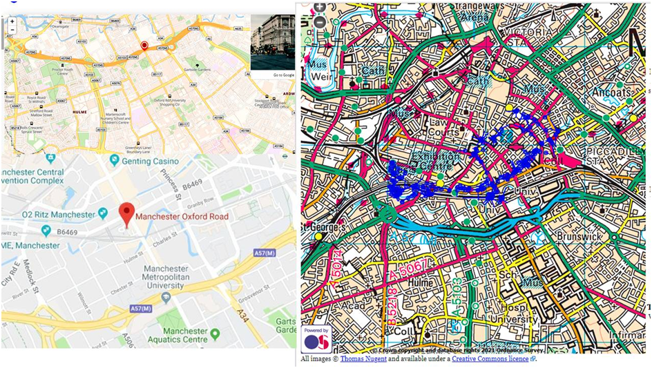 Hence it was great to see this poem (the vimeo can be downloable and watchable from this link and the text of the poem printable as pdf from the black box naming the poem at the top of the same page). And here I try to say the further thoughts on this issue that it prompted. It is titled as a poem about ‘place’ – the same place addressed by the other two commissioned poets, Hafsah Aneela Bashir and Reshma Ruia, The Oxford Road Corridor in Manchester. McMillan’s poem specifically addresses the concept of graphical representations of place – the meaning of topography – even in its title: topography: oxford road, map & key. The poetry of mapping is an honourable tradition in itself.