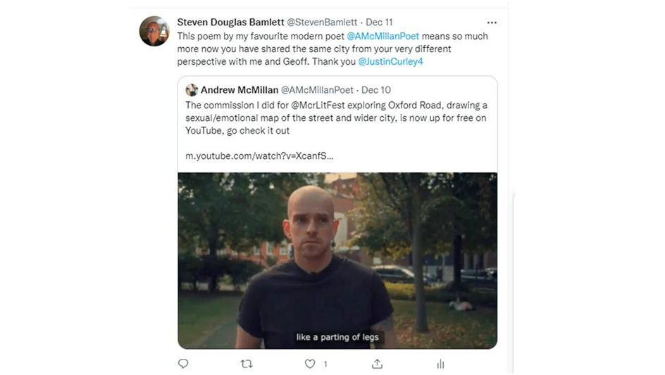 When I wrote that and my own later opinion of what this wonderful poet says about himself as a poet, I did not know a new work that was later made available on Twitter and the internet through the Manchester Literary Festival who commissioned it. But now I know it I can’t stop thinking about it and how it changes my view of things and the meaning of art I still like to label ‘queer’, rightly or wrongly in terms of the poet’s own intentions or motivations. This is how I concluded my blog by looking at an issue in the interpretation of photographs of male couples in a moment of perceived closeness.