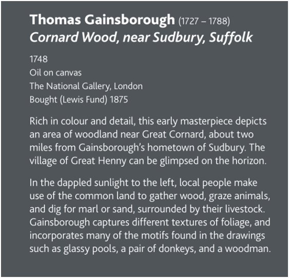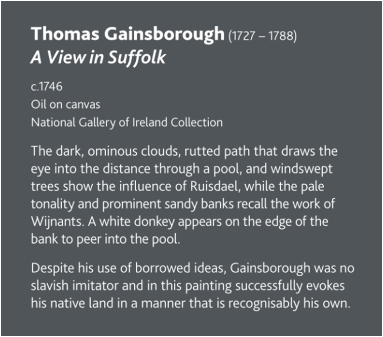 But before doing so we might examine another painting in the exhibition (partly because I love it so and especially its white donkey supervising the whole) which is A View in Suffolk (1727 – 1788). Here is a collage of painting, detail there from and the label from the exhibition.