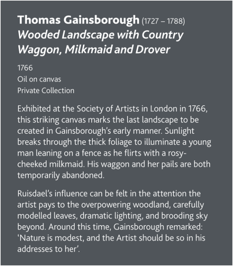 A collage of painting and detail of 1766 painting Wooded Landscape with Country Wagon, Milkmaid and Drover. Below the label from the exhibition.