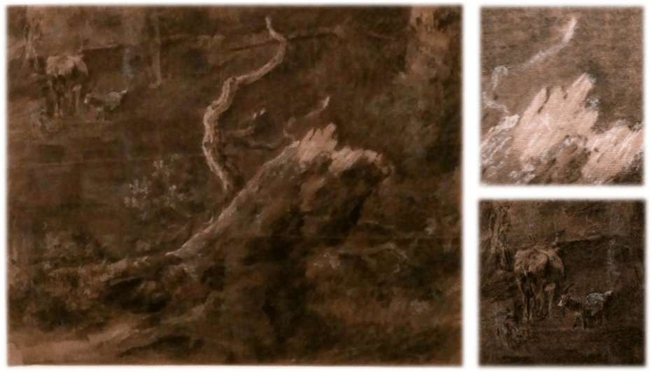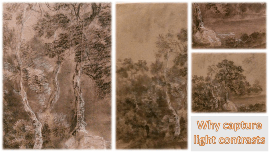 The answer to this question is not as obvious as it seems. It appears that Gainsborough is stressing the importance of the natural elements of landscape over the use of figures and narratives (History genre painting). But this need not be the case, especially given the rarity of compositions with at least one figure in the oeuvre. For the return of the eye from the overly sophisticated concerns of the human and the social story divorced from other considerations such as a regard for the unrefined truths of religion and nature. This it is still an ethical position to demand that human eyes consider themselves within a picture only to return to nature and truth with more glee. Given this view, we would expect drawings to examine how a recognisable natural object could be both recognisable and meaningful in the context of a comprehensive design of the whole picture. That a recognisable observed object look to be in its place however need not mean that mimetic capture of a ‘real’ object in a real place is the aim of painting. Far from it! And this is indeed what I felt I saw. Moreover, the techniques practised in the drawings need to show how contrasts of light and dark can be designed within the whole to be both meaningful ethically and recognisable as ‘natural’. Let us look at a sketch that the exhibition recognises as capturing at least one object from observed nature. In the first it is the stump of a decayed tree (the label precedes the collage of the drawing and two details).
