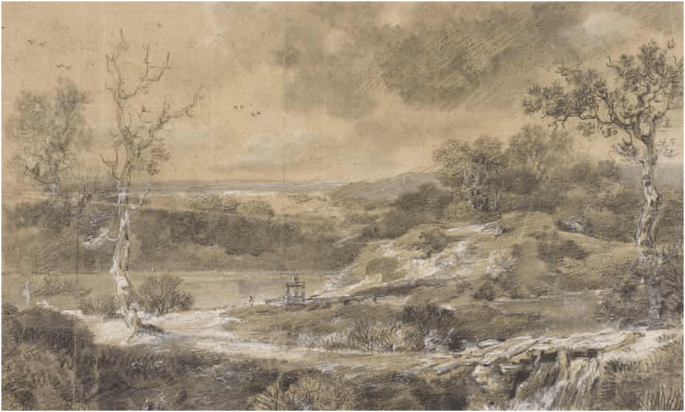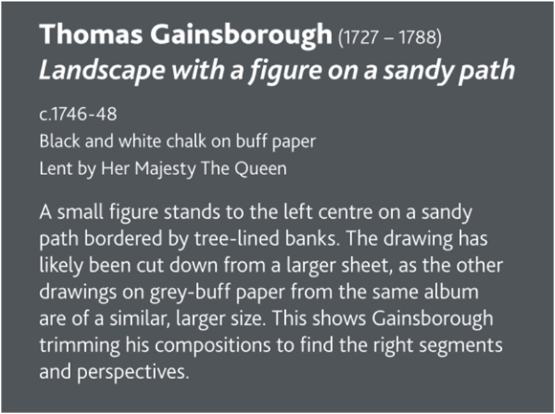 So on to the exhibition we went. The Exhibition related primarily to the 26 or so drawings found in the Royal Collection at Windsor in 2017, the story of which can be read at leisure in a report by Dalya Alberge in an article in The Guardian of that year.[1] Described correctly by Alberge in 2017 as ‘black-and-white chalk drawings – vivid depictions of landscapes around Sudbury, Gainsborough’s birthplace in Suffolk – have never been published or exhibited before’, even that last fact hardly stirs the blood of the mere viewer of art looking for a way into a tradition outside their experience. They were discovered in time to receive report in the latest Gainsborough biography by James Hamilton, Gainsborough: A Portrait, published also in that year and which I read. To Hamilton these drawings supported his own reading of the artist as “most inquisitive and energetic”.[2] But even this biography, with its intriguing and relevant readings hardly captured me for Gainsborough, although a latent liking has always drawn me to read more about him.