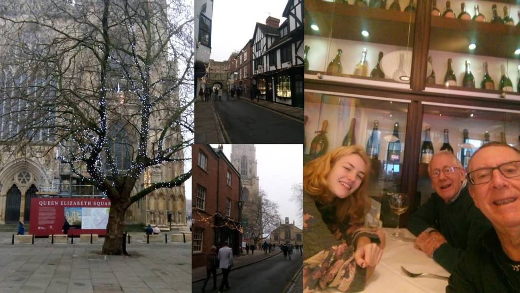 Nevertheless through the mistiest and coldest of days (it was probably much warmer than average Januaries) York’s architecture and street designs were putting on a gaudy show akin to the lights in the twigs of bare trees, the Bookfair was fun and dinner with young friend and physicist (daughter of friends near home but at university in York), Eleanor, more than pleasing.