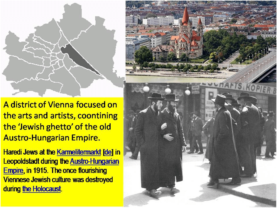 A space of confinement and oppression has however some secure places. This is so, at least, for the Merz family if not for unseen ranks of working-class Jews. Their name, Merz, has assonantal connection to the German for commerce and have risen in class and status ‘in one lifetime: ‘My grandfather wore a caftan, my father went to the opera in a top hat’. [1] Moreover, Leopoldstadt has changed its nature apparently to become what it now is again (though a ghetto again during Nazism before its destruction), the synonym of the Viennese arts. For Hermann, a factory-owner still, this is intimately linked to the Jewish character of Leopoldstadt, though an ethnic identity associated now with ‘liberty’ of religion amongst the Jewish population as a reflection of a more genuine liberty of space and ownership of those arts – producing AND consuming them: