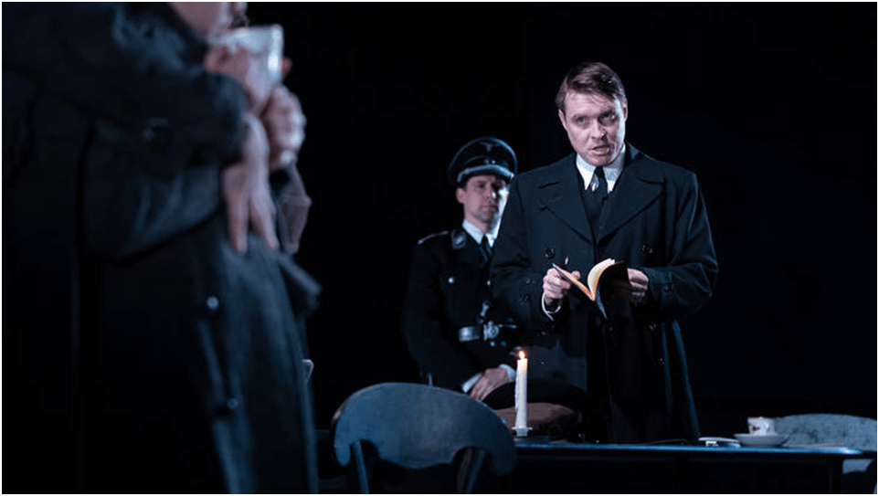 One of the most moving effects of the images screened thus – dramatic in the sense that it uses the efficacy of drama to reveal ‘facts’ and only gradually open up their significance and impact – is the projection of a hand-written version of the Merz family tree. At first its contents seem impossible not only to grasp but even compute or match with the persons we see on stage. Indeed the complexity of understanding intrafamilial relationships in such an extended family become one of the features of some of the speeches as characters misunderstand these relationships. only in the final scene, in 1955, do we realise this image is of a note handed to Leonard by Rosa as a way of understanding that tree – now that most of its members are dead. the play ends with the reading of the tree with summations of how each died, it is not only that this means the words Dachau and Auschwitz ring in our head and heart at the end of the play, but also that others died by suicide as the completion of a form of intense survivor guilt.