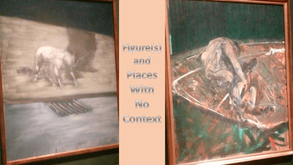 Art historical discourse when it is not about purely formal and compositional matters requires some way of discussing content in terms of the figures and places (even if these are idealised) but such knowledge is cut short by Bacon’s images where neither figures nor places have clear context – something often given away by vague titles that refuse specification.