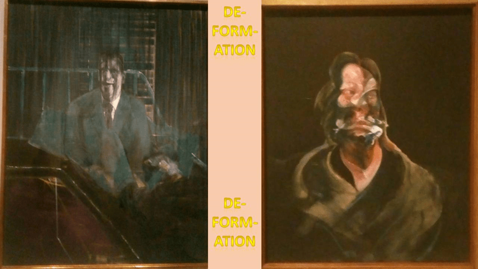 Bacon’s portraits purport – as above – to be figures we might recognise, although mainly people only known in Bacon’s close circle, they are also as easily describable as mere marionettes. They are anyway locked behind, to the point where it blurs vision and takes away pretence of a likeness to animal, human or ghost, by striations of surface paint.[10] The deformations of the face of Isabel Rawsthorne above too in the 1966 portrait cannot be explained as a perspectival experiment as in cubism. We have to be open to a flesh that is refusing formation or definition.
