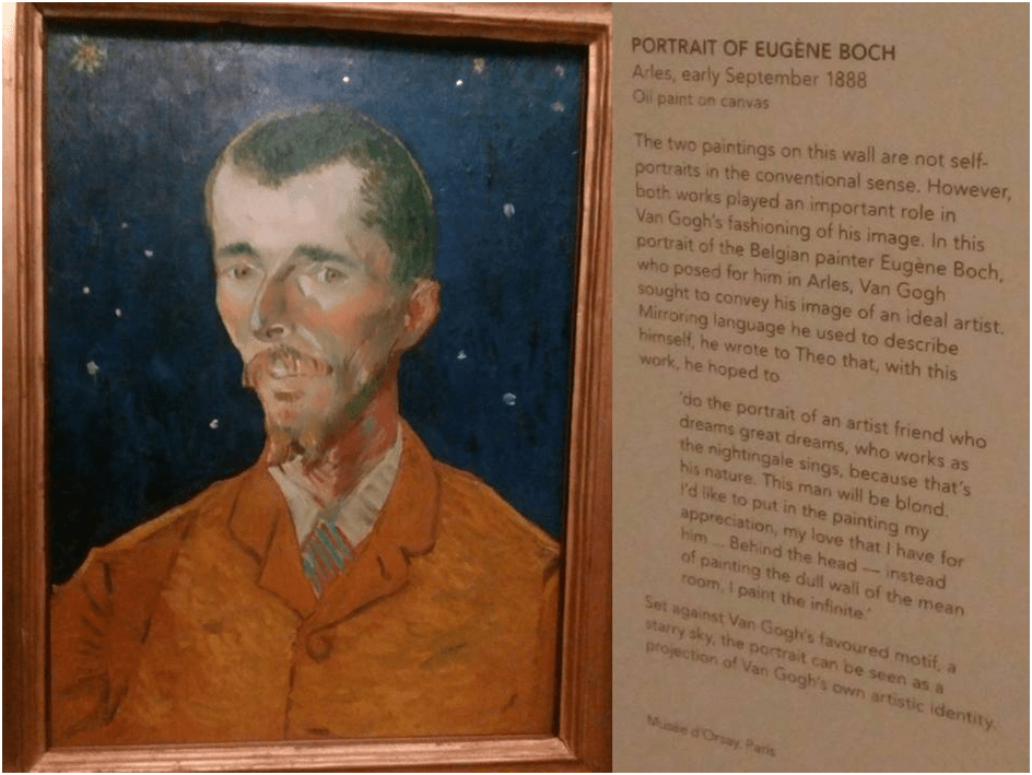 Romanticism required that knowledge of a thing and the worlds that contained it should be much more than a static or dead object of thought. The ‘monumental’ in art, even in its very vaguest use as meaning ‘something very significant’, pertains to a thing that is unchanging and essentially rigid in form, something meant to outlast the ‘living’ of many generations. And Van Gogh is the heir of Romantic philosophers and artists in many media. Hence his art has to live qua art – as the thing it is. This is, in my view, why he sought the appellation ‘colourist’. He need be that which redeems the life otherwise monochrome and containing only forms bounded by lines in its appearance and effect. Surely that is why, if we look for a manifesto of art as painting we look to, as Tilborgh shows us in his essay and the show in its caption (reproduced below), Portrait of Eugène Boch (Sept. 1888).