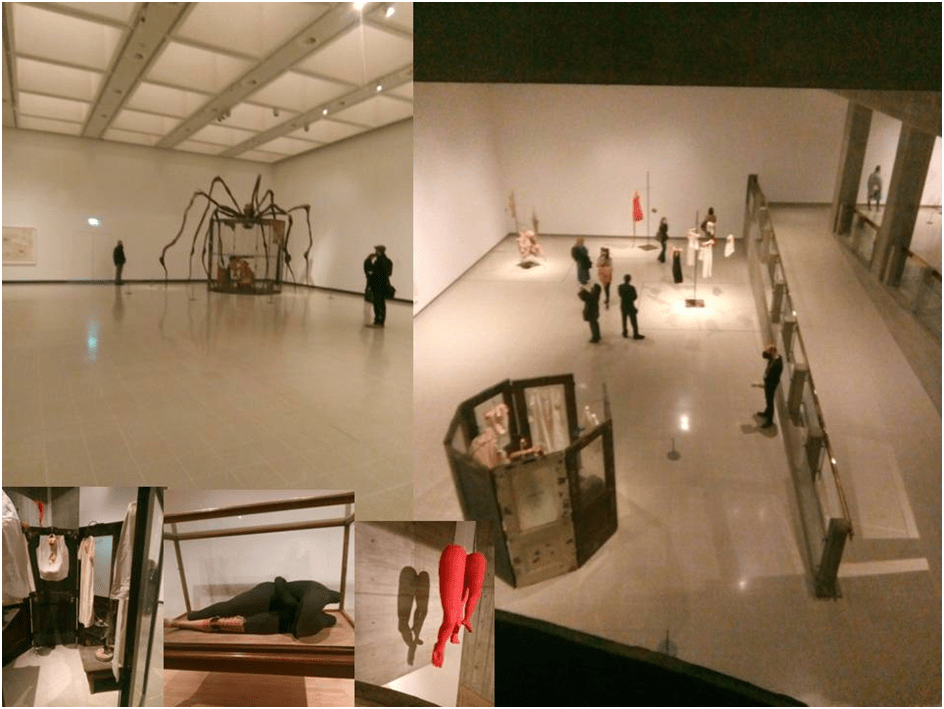 This is not the first Bourgeois exhibition I have seen. Moreover I have seen single works in disparate places but it is the most satisfying, though I clearly enjoyed Tate Liverpool’s more intimate small ‘Artist Rooms’ exhibition earlier this year (see my blog on that exhibition at this link). But in the case of this exhibition the space offered by the interior architecture of the Hayward, with its blind spots and reveals of spaces you have previously trodden, varied levels afforded by a mezzanine between first and second floor and different kinds of experience of ascent and descent, for those who can take the stairways (lifts are available) fit Bourgeois’ complex feel for spatial differentiations in relation to her sculptural work perfectly. You might get some idea of the spatial offerings from the collage of my photographs from the day below.