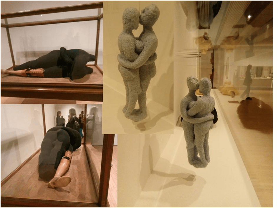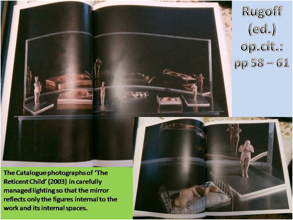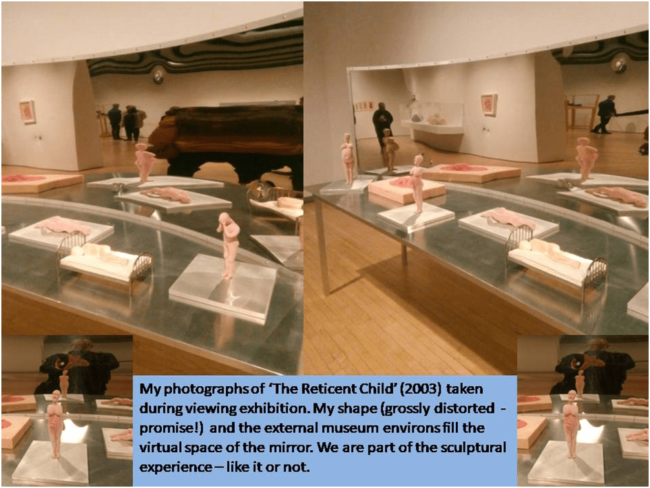 Smaller pieces are likewise placed in environments that emphasise their small size and common vulnerability. This point is emphasised in the piece known as The Reticent Child (2003) which is placed on a steel table backed by a concave mirror. The catalogue photographs it in a complexly lit dark environment so that we see only the reflected (and enlarged) small figures placed as if they are telling us a story (perhaps). In fact the viewer sees themselves – usually their clothed torso in the mirror, uncomfortably enlarged as in a fairground ‘fat mirror’ as you will see in comparing my and the catalogue photography (theirs is better and professional but not therefore nearer to the way we ought to understand Bourgeois’ play with the emptiness and apparent filling of space, that inevitably includes the viewer themselves).