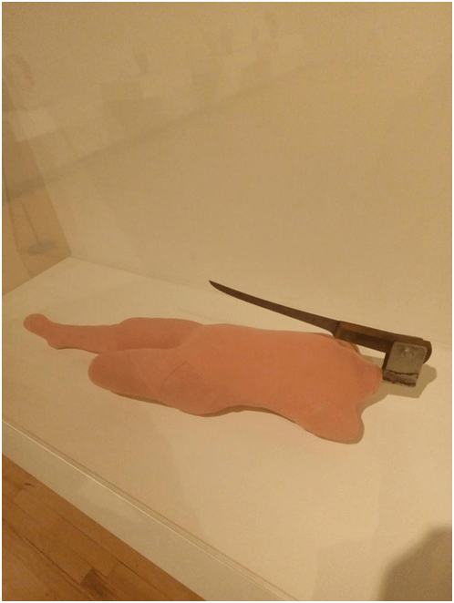 Fabric is a soft material. It yields, even to the eye’s imagination, because it is already filled with substance that repels the viewer or alternatively faces us with the temptation to cut into it. I think ‘The Reticent Child’ plays with ideas of softness and hardness as indicators of emotion and sometimes sex/gender. This is also surely one of the responses we have to the small piece Knife Figure (2002) in which the hard material of a domestic knife is forever suspended above a body of pink flesh-resonant material that it may already have substantially dismembered (of a leg below the knee, arms and head), merely to find its has still no empty middle which the viewer might fill with referential or interpretative meaning. And yet the body looks still like a lump of viscous fluid.[4]
