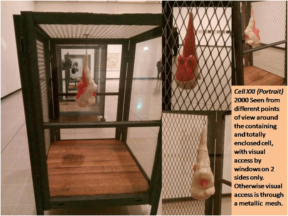 At other times the ‘softness’ of a fabric sculpture is held or contained in the protective shell of an entirely enclosed Cell, which both guards its security and imprisons it. One of the pieces I loved was one such. It is named Cell XXI and is brilliantly described by Rugoff, in a manner that holds me off from attempting another, though it does not discuss the import of the surrounding cell structure, which provides an indubitably hard case to its softer subject, as I hope I show in this collage piece showing different perspectives on the structure from points of view around the cell itself.