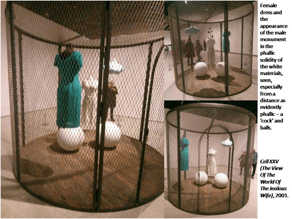 Rachel Cusk in the exhibition book reads this complexity, as I read her at least, in a much more binary way contrasting the pull in Bourgeois between a ‘male’ monumentality in the work to which she aspires, using the ‘solid and permanent materials’ of earlier work and the play with the ‘materials of female disposability’ – clothes and soft materials which are temporary (or ‘futureless’) in their attraction and availability for use – ‘the “flimsy” materials of female monument-making’.[8] Although not discussed by Cusk, I think, Cell XXV (The View Of The World Of The Jealous Wife) uses monumental white to create a faux masculinity, in the form of arrangement of a hanging dress and two large ball shape structures at its base. The arrangement of clothed hanging (wo)manikins within the space appears to show the fragmentation of one woman between several roles and fragments of roles associated with the body or the way in which maleness fragments her attention between self and Other (Woman) with whom she competes and may aspire to be. The Cell itself confirms her entrapment within a realm where power is male or appears to be so. Her only alternative is that she inadequately represents her iconic status and reduces the female to the code given by consumable fabric used for clothing.