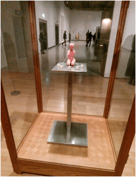 In Untitled (1998), contained in a vitrine (as if a valued piece perhaps ironically, the viscera are rounded, appearing as breasts or perhaps gonads or as functionally non-sexual inner parts. The white piece recalls, being pendulous, a penis (or a clitoris perhaps). Here ironic valuation of the soft viscera is, I think, deliberately coded confusingly such that binary divisions of male and female are not so easily interpreted from them.