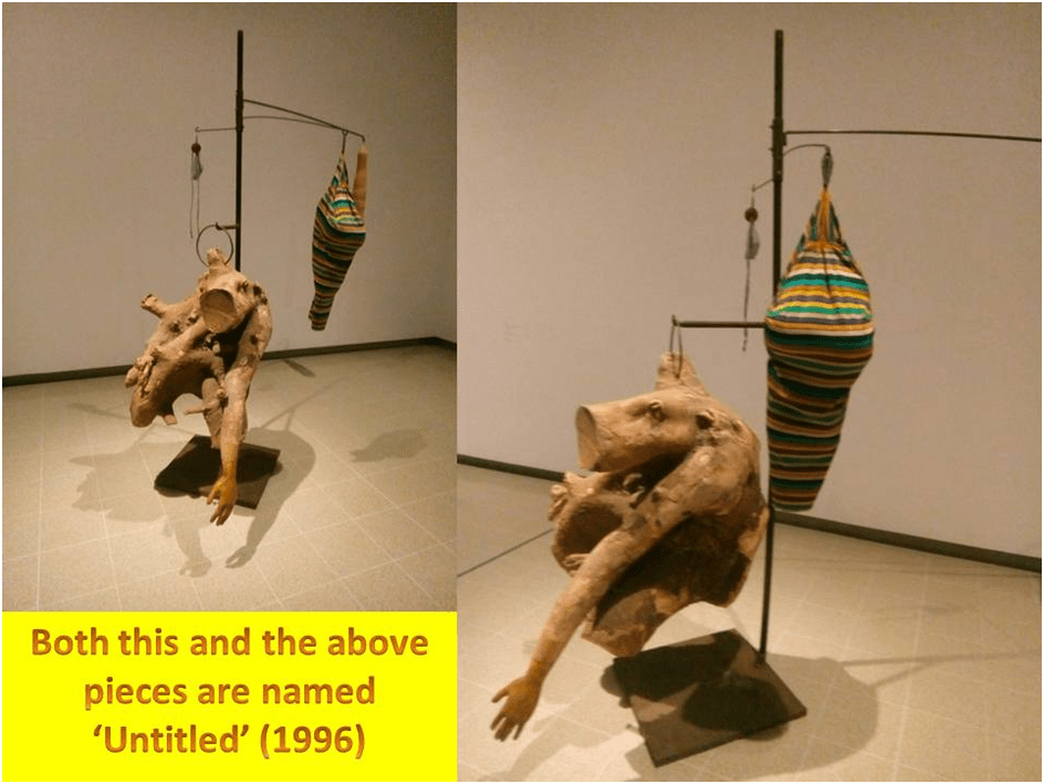 The ‘monuments’ to this are in Bourgeois’ final ‘pole pieces, in which femininity is transformed to sexualised (for the eyes of heterosexual male designers) clothing and hung as a rack for sale and / or display for the purposes of feeding a sexual fetish. That these pole pieces also mask the hanging of meat in a butcher’s shop, where the fragmented body is a woman as animal is conveyed by hanging the clothes on well-cleaned real or fashioned animal bones from different anatomical regions of a large animal but acting as clothes hangers as in the first Untitled (1996) piece below or rendered as mangled and dead body parts or processes meats (hams, sausages and barely recognizable carcases still bearing the likeness of its dead face (a pig here with a woman’s arm and hand suspended as if an udder) in the second piece with same title and date which are the first pieces we see in the exhibition. The point about the second piece however is that the coding of sex/gender is less clear than it is in the first. As Bourgeois’ work advanced I think she veered towards representing the similarity of the softness of inner visceral anatomy of all sex/gender variations rather than surface coding of either body parts or their coded cultural dressing.